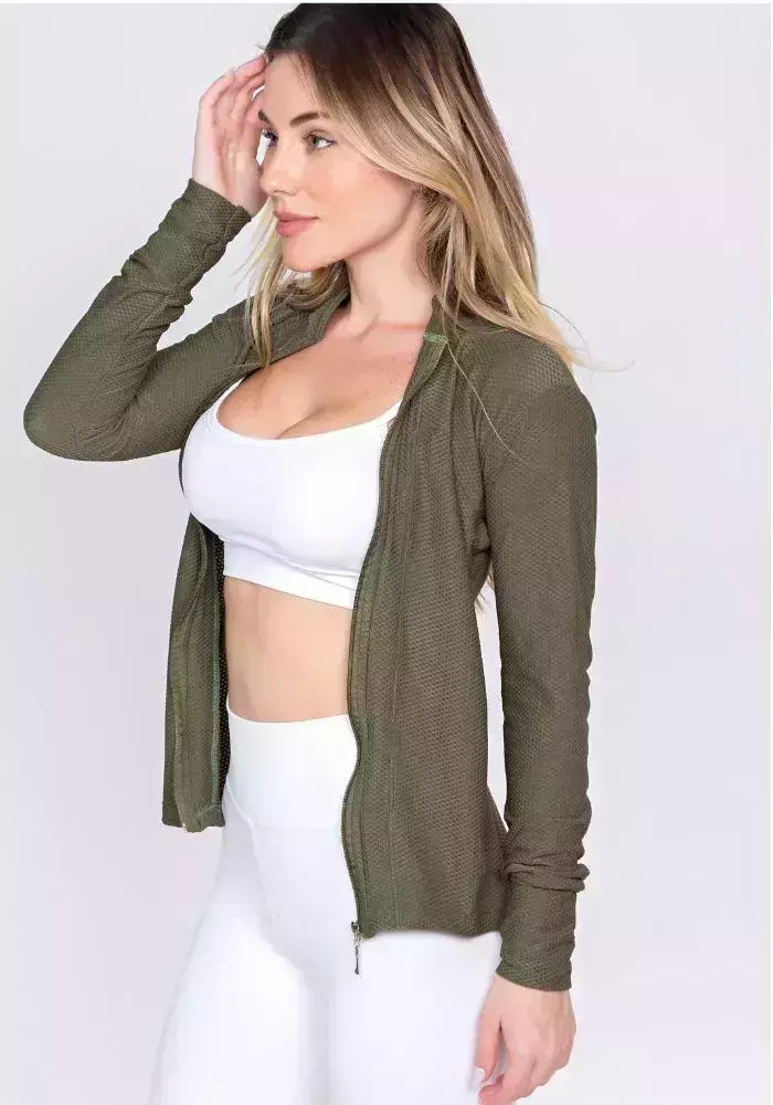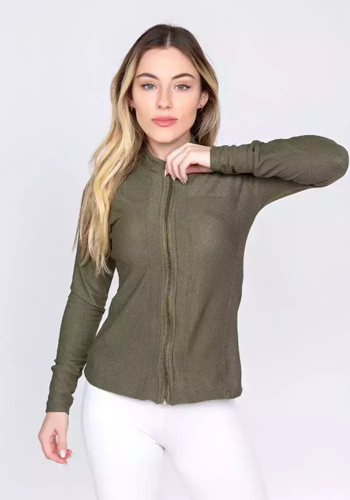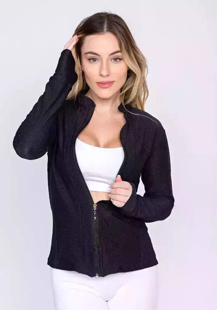 Detalhes Funcionais: zíper frontal resistente e dedeiras nos punhos para maior proteção e praticidade.